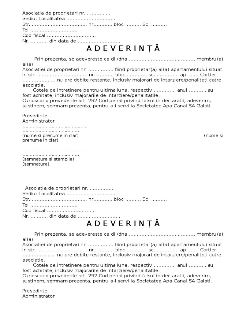 Adeverinta Asociatia De Proprietari Locatari 1