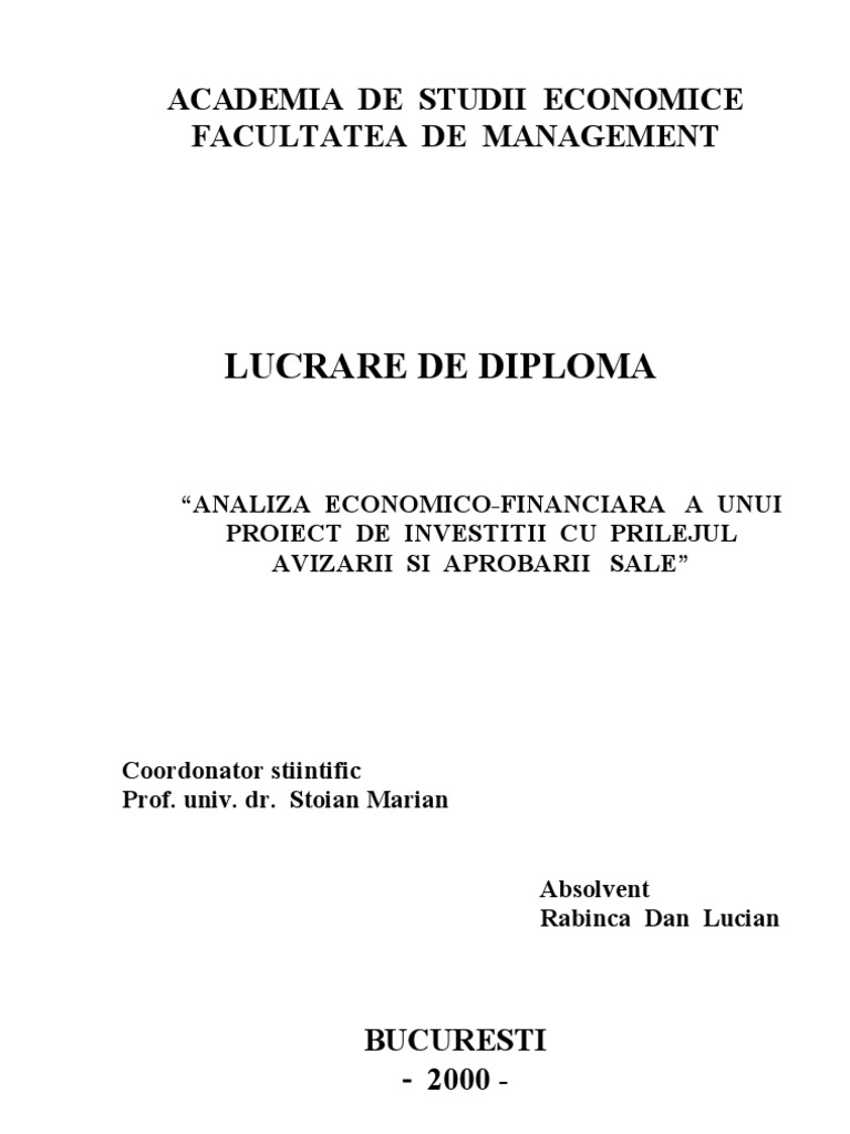 Analiza Economico Financiara A Unui Proiect De Investitii Cu Prilejul Avizarii Si Aprobarii
