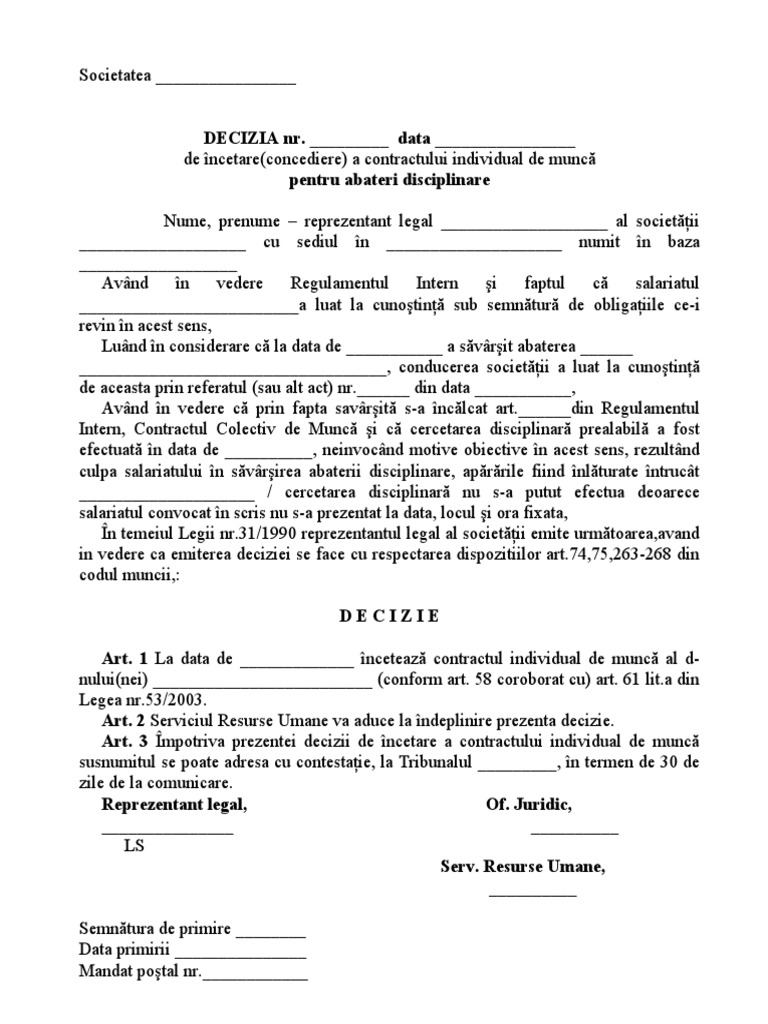 Model Decizie Concediere Disciplinară Art 61 Lit A Cm Theexperts Ro
