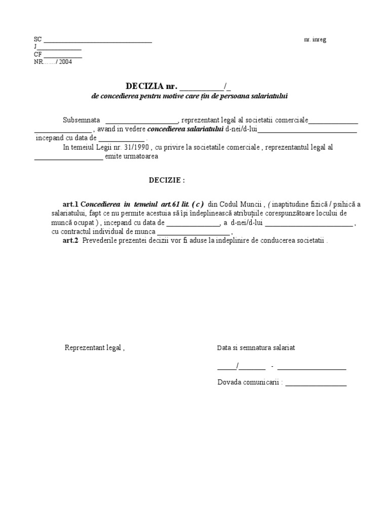 Decizie De Concediere Art 61 Lit A Model Itm