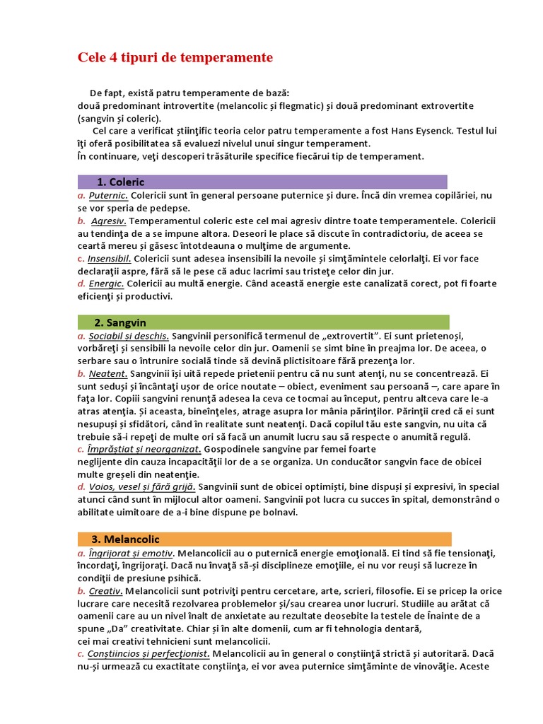 Pagina De Folos Cele 4 Tipuri De Temperamente Coleric Sangvinic Flegmatic Si Melancolic