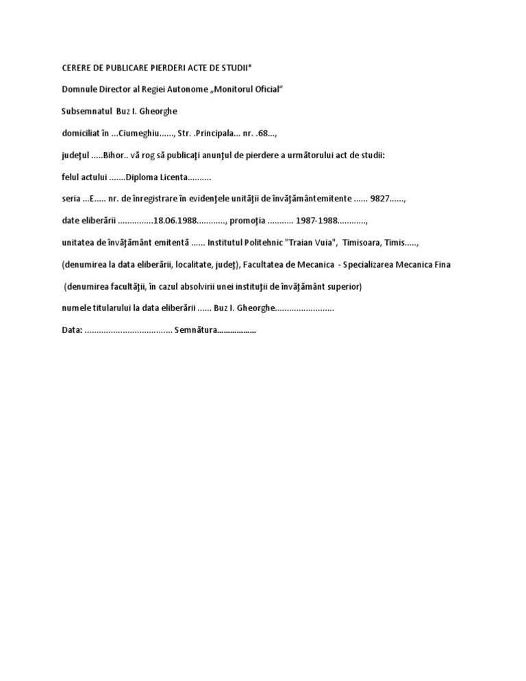 Cerere De Publicare Pierderi Acte De Studii