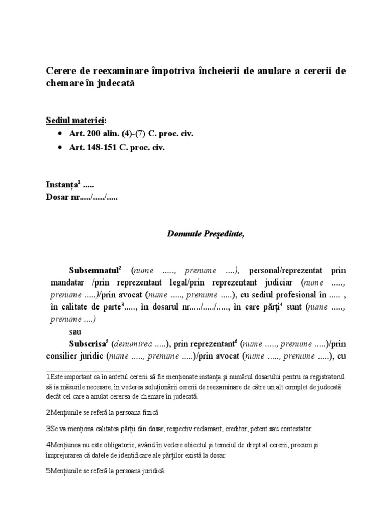 Cerere De Reexaminare Impotriva Incheierii De Anulare A Cererii De Chemare In Judecata