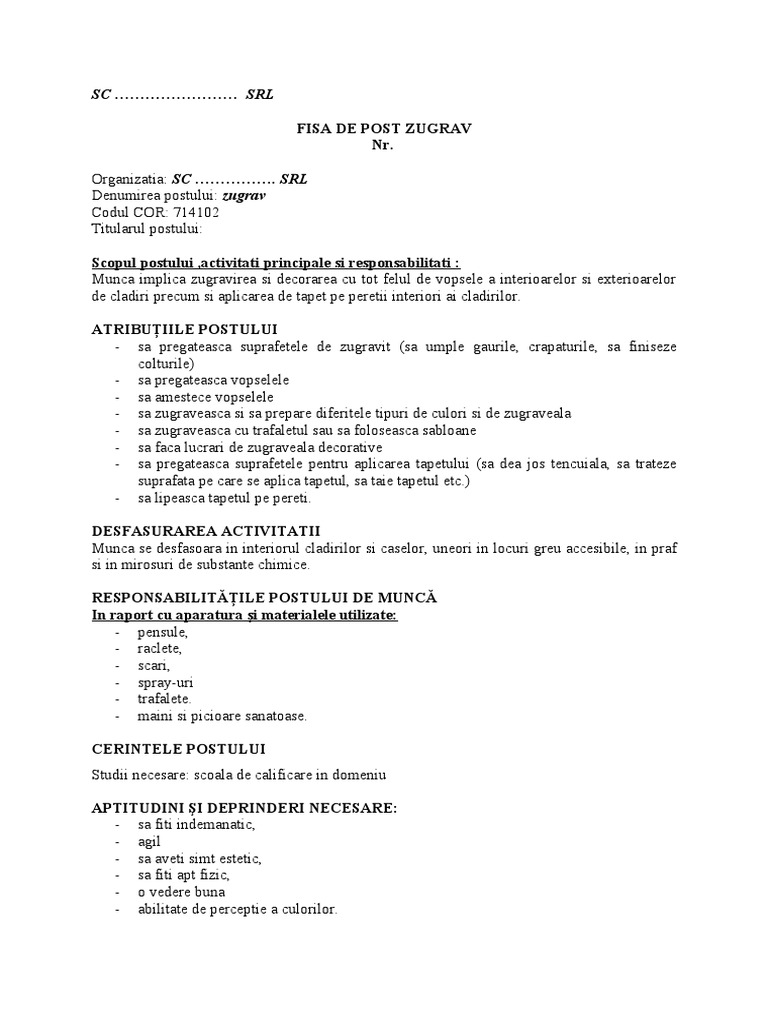 Fisa Post Functionar Administrativ Protectia Muncii