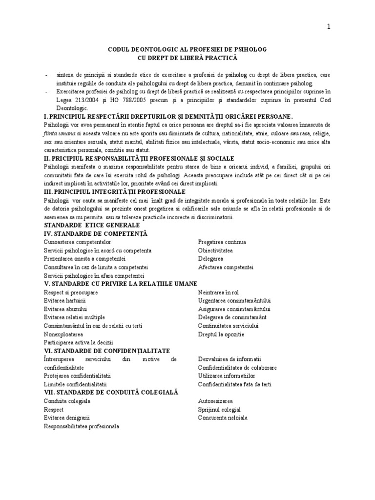 Doc Codul Deontologic Codul Deontologic Al Profesiei De Psiholog Cu Drept De Libera Practica Nikora Agata Academia Edu