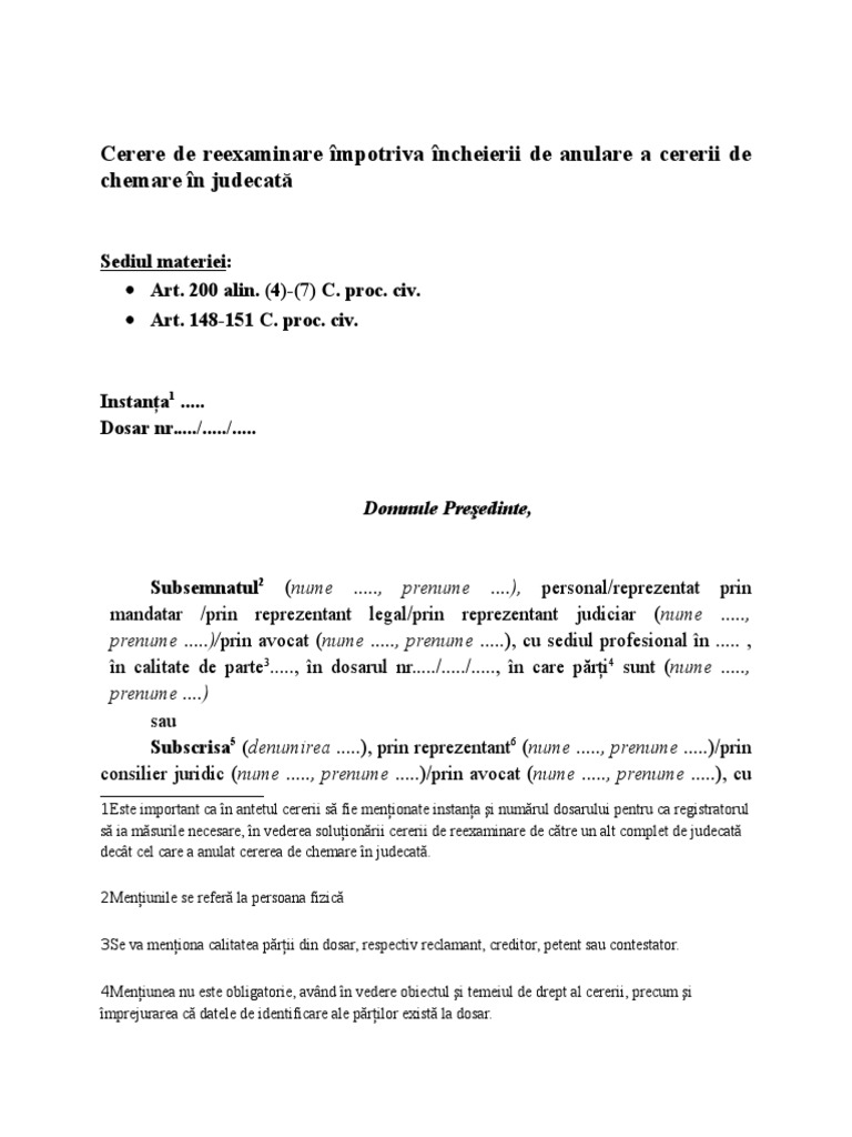Cerere De Rededeexaminare Impotriva Incheierii De Anulare A Cererii De Chemare In Judecata