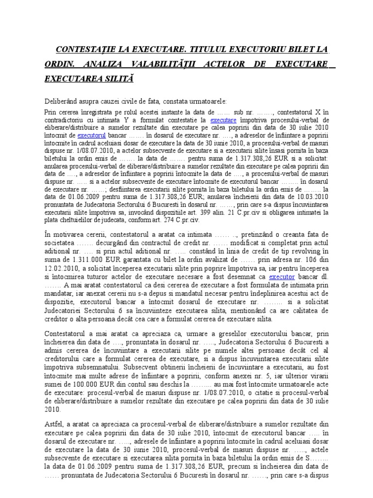 Serviciu de urgenta 24 ore din 24 7 zile din 7 la numarul de telefon 0766 883 875 sau whatsapp. Contestația la executare reprezintă mijlocul procesual prin care în cea de a doua fază a procesului civil părțile sau terțele persoane vătămate prin executare invocă în fața instanței competente nereguli referitoare la actele de executare săvârșite în cauză în vederea anulării îndreptării actului de executare contestat sau pentru a se obține anularea ori. 667 ncpc prin care debitorul a fost somat la plata sumei de 9 000 euro şi 17 365 lei reprezentând despăgu biri stabilite prin titlul executoriu sumă ce nu cuprinde şi actualizarea. 1 1 raportat la art.