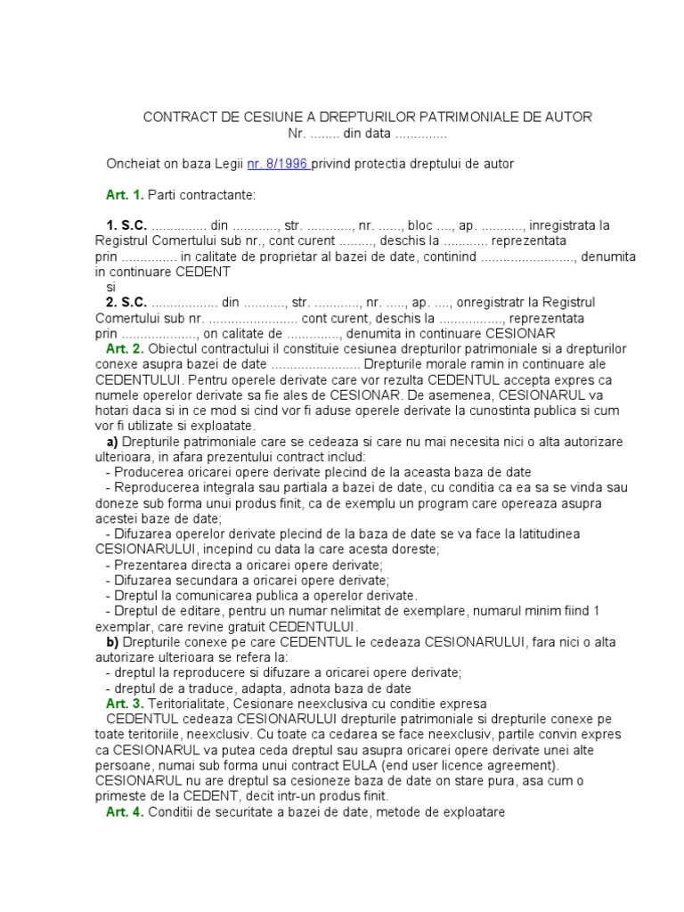 Contract De Cesiune Drepturi De Autor Sc Srl Cu Sediul In Bucuresti Str Nr Bl