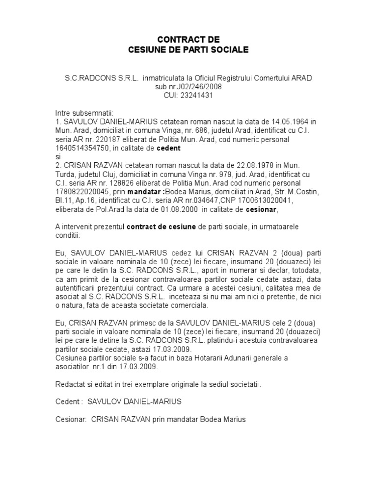 Ungureanu Si Asociatii Contract De Cesiune De Părţi Sociale