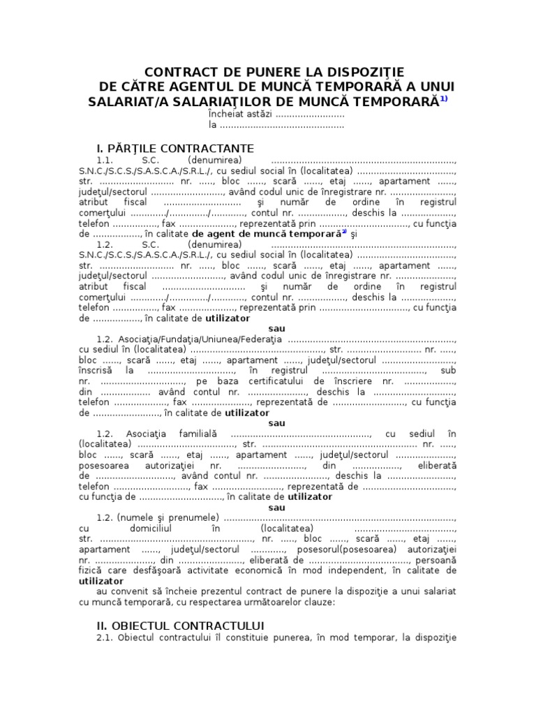 2 contractul de munca temporara se incheie de obicei pe durata unei singure misiuni dar legea permite incheierea acestuia si pentru mai multe misiuni. Utilizatorul este persoana fizică sau juridică pentru care și sub supravegherea și conducerea căreia muncește salariatul temporar pus la dispoziție de către agentul de muncă temporară. B 5 zile lucratoare in cazul in care contractul de munca. Contractul de munca temporara reprezinta o particularitate a contractului individual de munca incheiat intre agentul de munca temporara si salariatul temporar pe o perioada determinata numita conform legislatiei in vigoare misiune.
