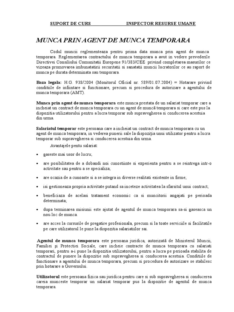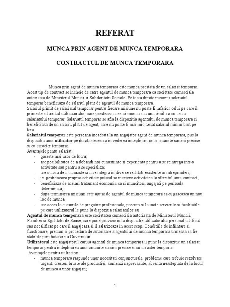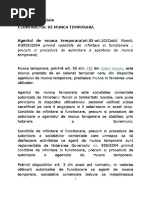 Contract de munca temporara. La munca temporara se poate concedia pe nemotivate sau concediere ce nu are legatura cu angajatul si poate beneficia de somaj. Munca prin agent de muncă temporară munca prin agent de muncă temporară munca prestată de un salariat temporar care a încheiat un contract de muncă temporară cu un agent de muncă temporară şi care este pus la dispoziţia utilizatorului pentru a lucra temporar sub supravegherea şi conducerea acestuia din urmă. Contractul de munca temporara pe perioada determinata se poate inceta si cu art. In contractul de munca temporara sunt precizate urmatoarele elemente.
