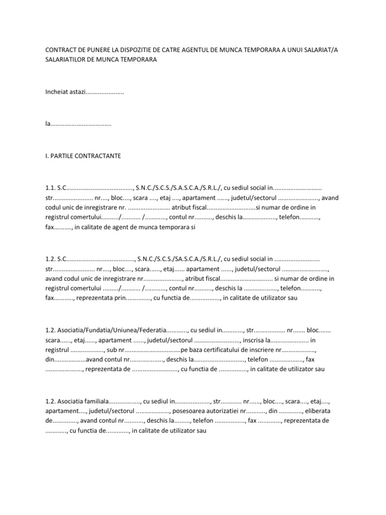 Agentul de munca temporara este echivalentul angajatorului. Daca contractul s a incheiat pentru mai multe misiuni toate insumate nu pot depasi 36luni. A doua zile lucratoare in cazul in care contractul de munca temporara este incheiat pentru o perioada mai mica sau egala cu o luna. Contractul de munca temporara este un contract individual de munca ce se incheie in scris intre agentul de munca temporara si salariatul temporar pe durata unei misiuni.