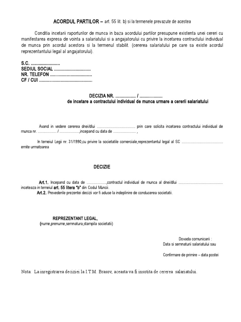 Decizie Incetare Contract De Munca Art 55 Lit B