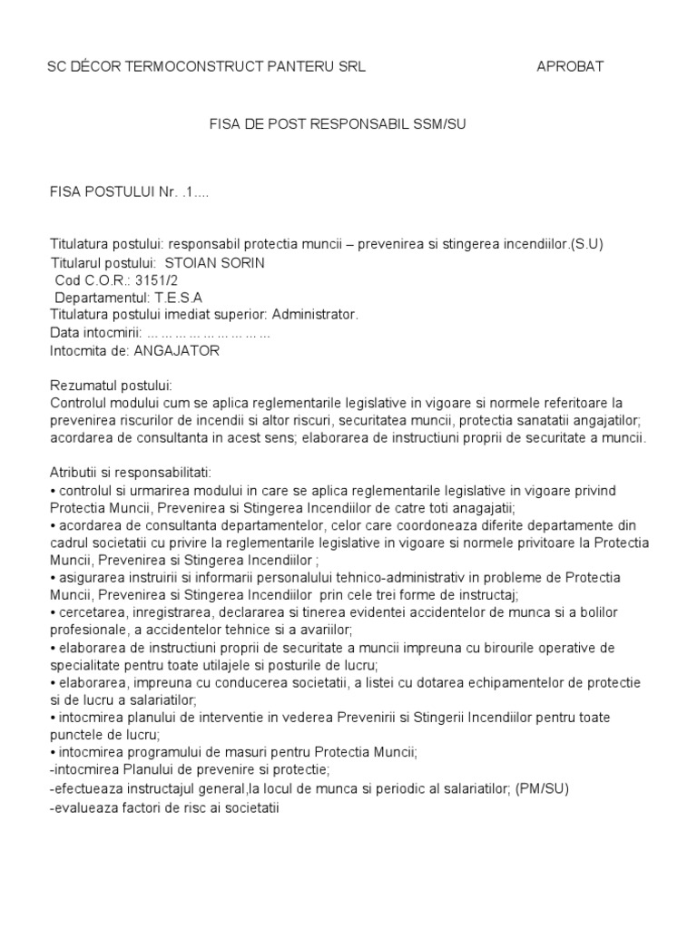 Fisa Postului Codul Muncii