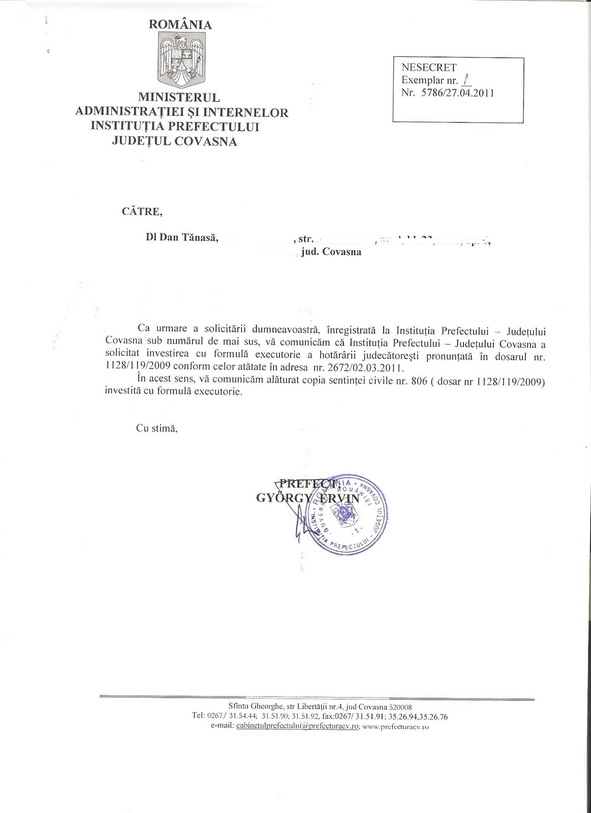 Eficienta Institutiilor Statului In Slujba Intereselor Udmr Dupa Un An De Zile Prefectul Judetului Covasna Udmr Istul Gyorgy Ervin A Investit Cu Formula Executorie Sentinta Prin Care Tribunalul Covasna A Anulat Autorizatia De