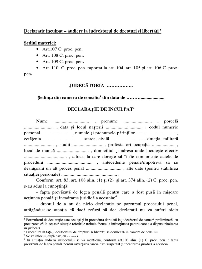 Declaraţie Inculpat Audiere La Judecătorul De Drepturi Si Libertăţi