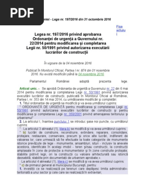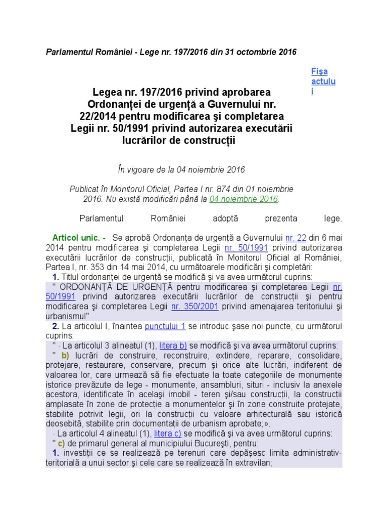 Legea Nr 197 2016 Privind Aprobarea Ordonanței De Urgență A Guvernului Nr 22 2014 Pentru Modificarea și Completarea Legii Nr 50 1991 Privind Autorizarea Executării Lucrărilor De Construcții Lege5 Ro