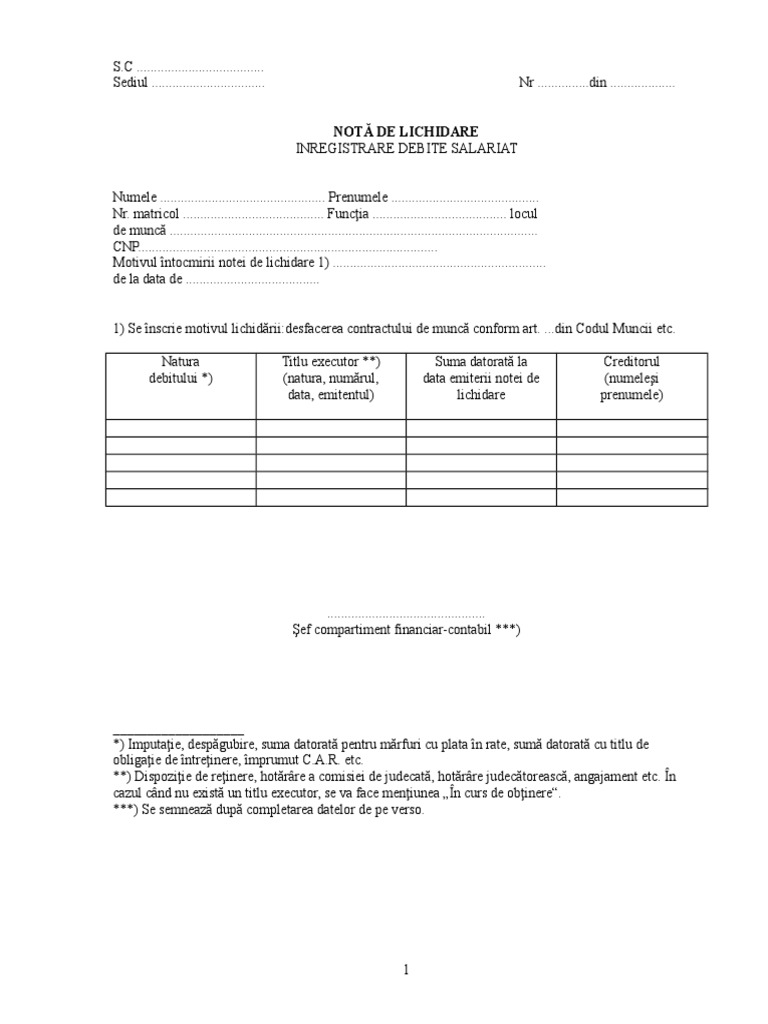 Nota De Lichidare Debite Salariat