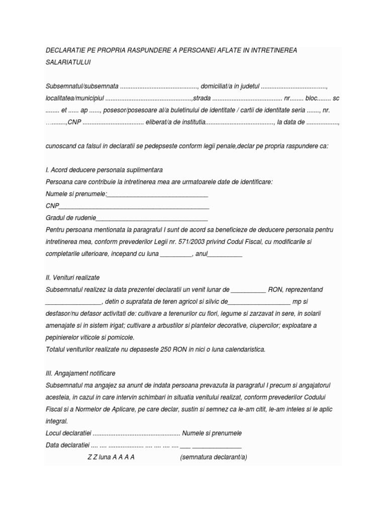 Model Declaratie Proprie Raspundere Persoane In Intretinere