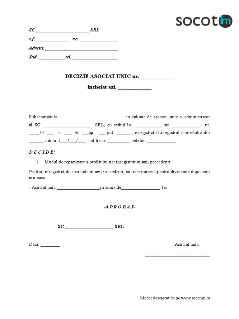 Model Decizie Distributie Dividende Asociat Unic Socotim