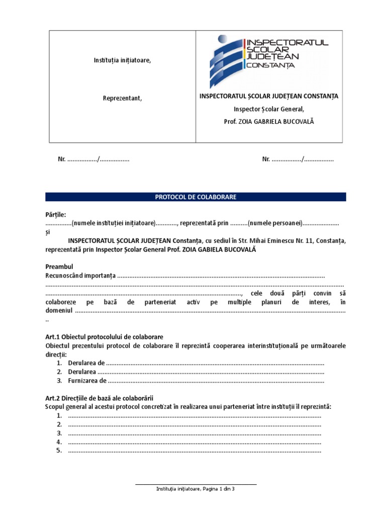 21 31 înregistrată la registrul special al asociațiilor si undațiilor sub numărul 36 infiintata la data de 25 03 2009 cod fiscal nr 25368700 reprezentată de d na. Aveti la dispozitie un model de protocol de colaborare intre o unitate scolara si o asociatie avand acelasi profil. Prezentul protocol de colaborare intra in vigoare la data semnarii de catre ambele parti si este valabil pe o perioada de un an urmand a fi prelungit automat cu cate un an daca nu este denuntat de nici una din parti cu cel putin 30 de zile inainte de incheierea valabilitatii. Protocol de colaborare încheiat între.