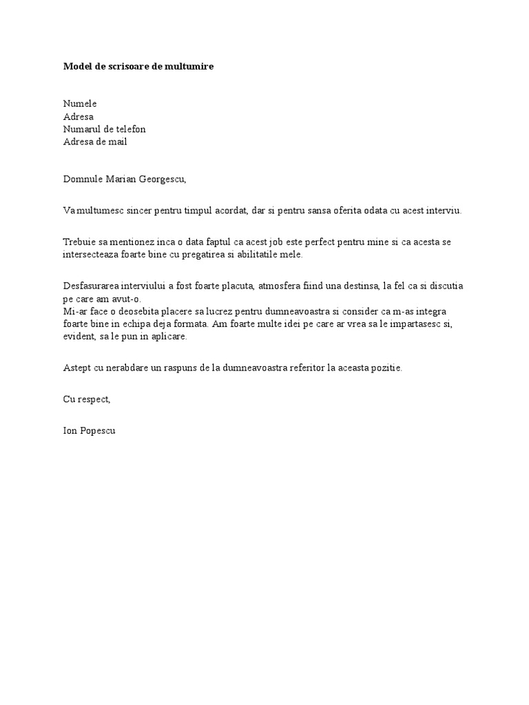 Model Scrisoare Multumire