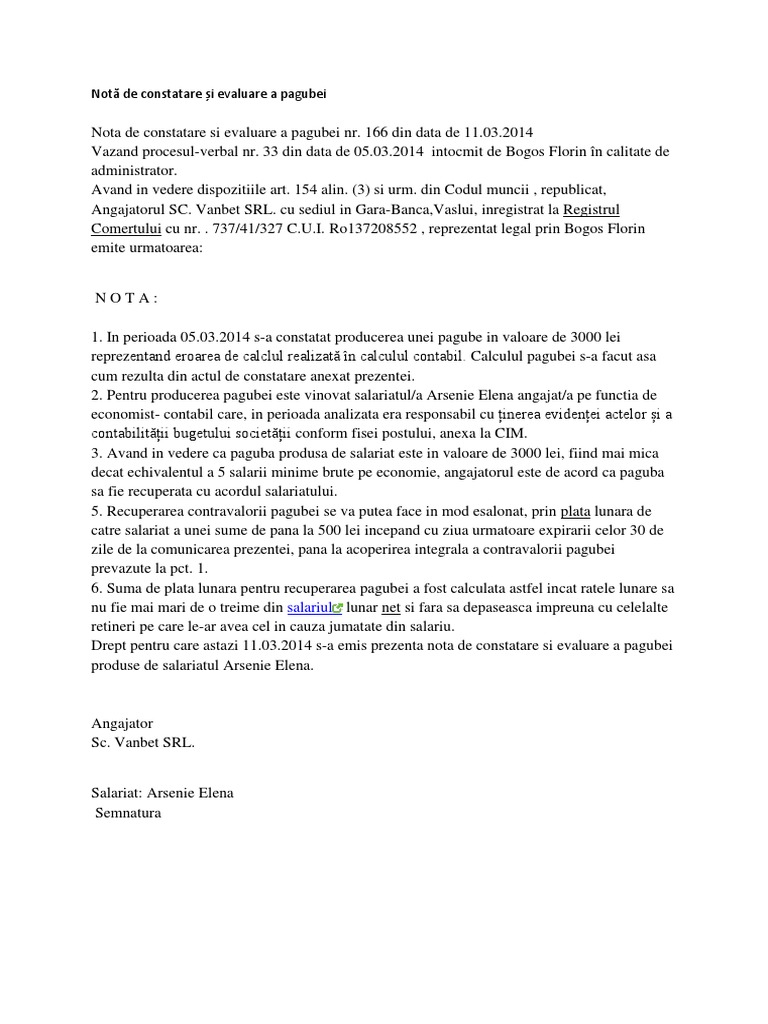 Nota De Constatare Si Evaluare Paguba