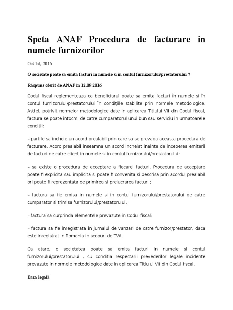 Speta Anaf Procedura De Facturare In Numele Furnizorilor