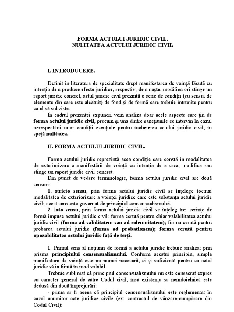 Capitolul i introducere in studiul nulitatii actului juridic civil. Nulitatea relativă aceea care sancţionează nerespectarea la încheierea actului juridic civil a unei norme juridice care ocroteşte un interes individual particular deci a unei norme juridice imperative de ordine privată care instituie o condiţie de validitate pentru încheierea actului juridic art. Menita sa asigure respectarea conditiilor de validitate a actului juridic stabilite de lege sau de parti nulitatea trebuie pe de o parte sa nimiceasca total acele efecte ale actului juridic care sunt potrivnice scopului edictarii conditiei de validitate nerespectate dar pe de alta parte sa lase neatinse. în schimb dacă este cazul notarul public trebuie să invoce motivul de nulitate relativă dacă are cunoştinţă de existenţa acestuia şi să refuze autentificarea actului iar aceasta indiferent dacă părţile solicită încheierea actului juridic în forma ad validitatem cerută.