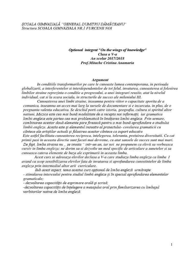 Optional Integrat Limba Engleza Clasa A V A