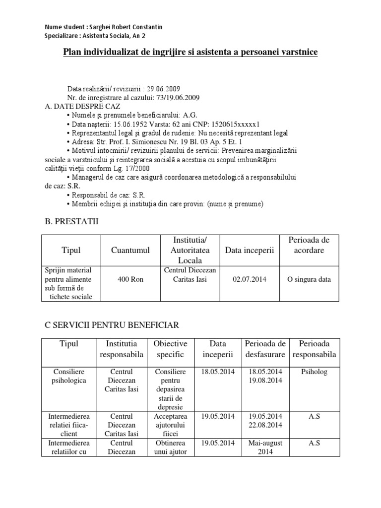 Plan Individualizat De Ingrijire Si Asistenta A Persoanei Varstnice Docx