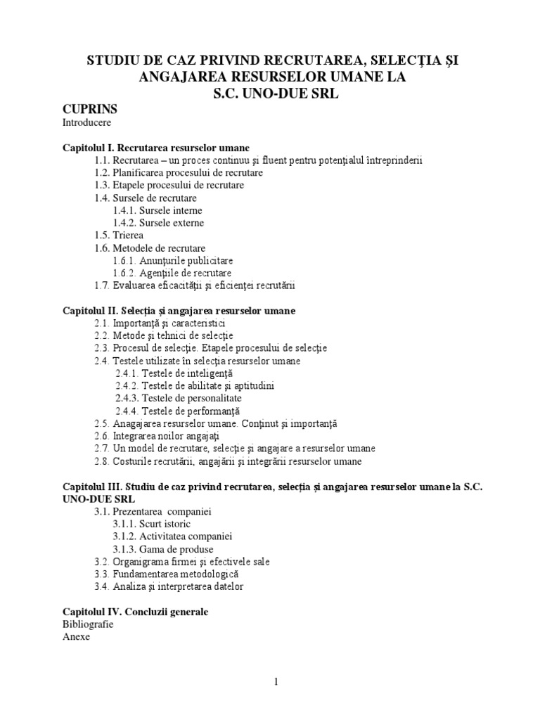 Studiu De Caz Privind Recrutarea Selecţia Si Angajarea Resurselor Umane La Sc Uno Due Srl Pdf