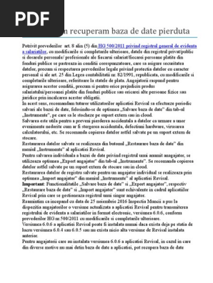 Recuperare baza de date revisal. O astfel de baza de date in format valid pentru import angajator se poate obtine in urma realizarii unei operatiuni de export angajator sau ca raspuns din partea inspectoratului teritorial de munca la solicitarea angajatorului de recuperare a bazei revisal. 1005 din 19 decembrie 2017 cuprinde noua reglementare a registrului de evidenta a salariatilor. 905 2017 privind registrul general de evidenta a salariatilor publicata in monitorul oficial nr. A copie xerox de pe chitanta prin care s a achitat taxa de recuperare revisal b cerere privind solcitarea de recuperare revisal obligatoriu de specificat cui denumire adresa de e mail la care se va transmite mai tarziu baza de date recuperata.