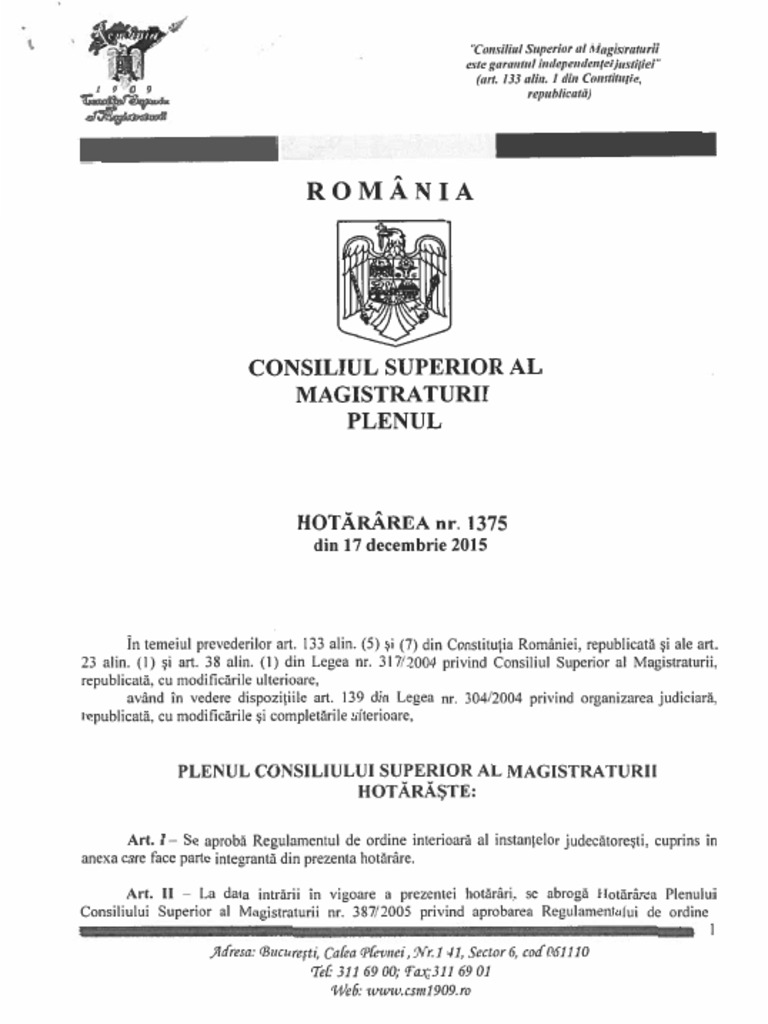 6616 Hotararea Csm 1375 2015 Regulament Ordine Interioara Instante Judecatoresti